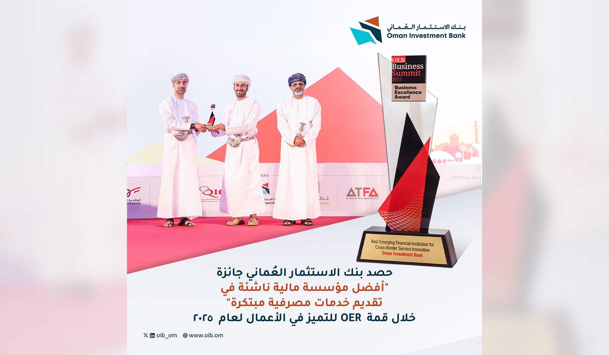 حصد بنك الاستثمار العُماني جائزة “أفضل مؤسسة مالية ناشئة في تقديم خدمات مصرفية دولية مبتكرة” خلال قمة OER للتميز في الأعمال لعام ٢٠٢٥